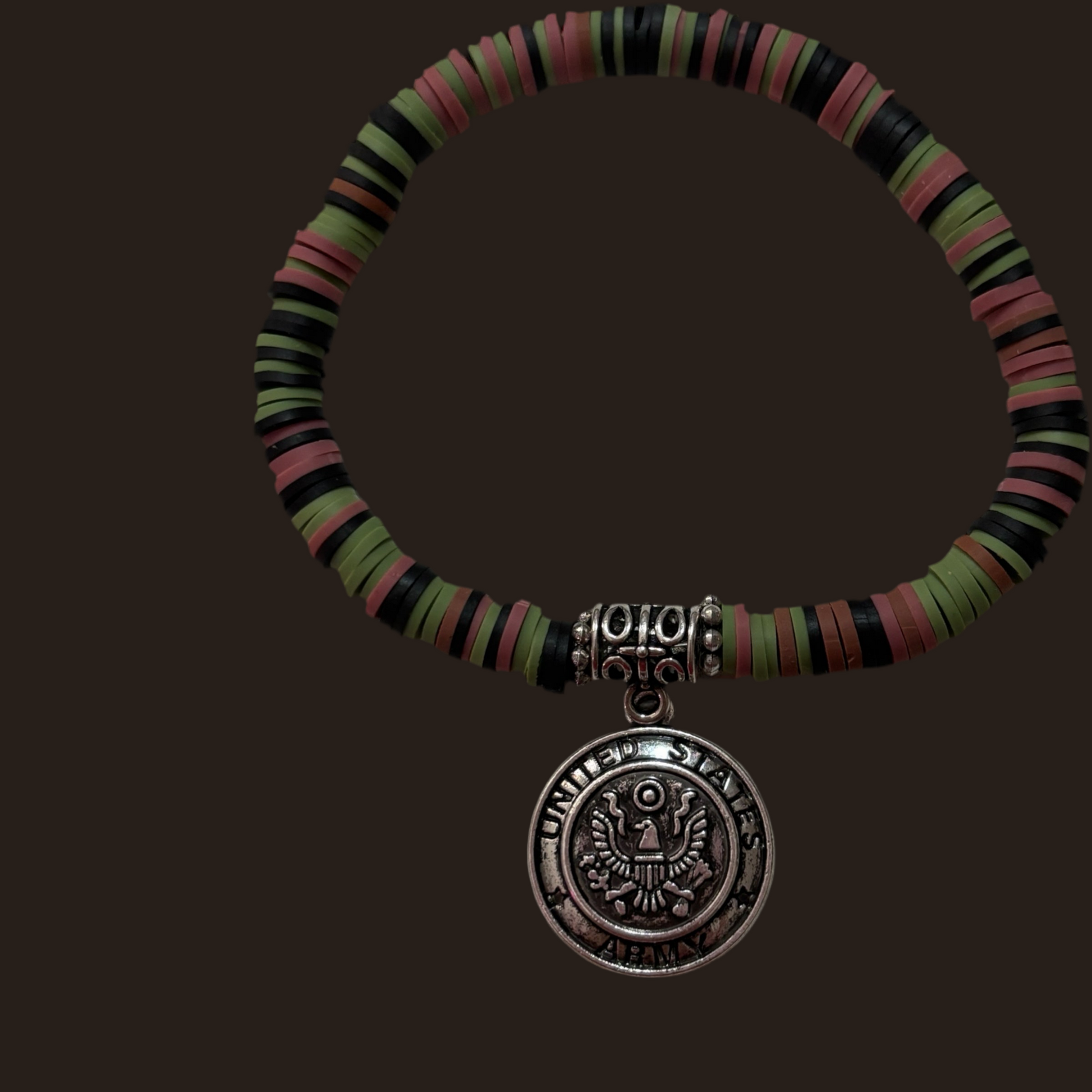 Great military looking bracelet handmade with love and care. Camouflage looking clay beads and dangling Army charm. (Other Forces are available).